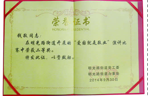 在硕果累累的金秋季节,我们迎来了共和国65周年华诞。为庆祝国庆65周年,深入开展我市群众路线教育实践活动,9月31日,瑶海区明光路街道举办了以“爱岗敬业”为主题的演讲比赛活动,我院派出了客服部才女钱敬参赛。终,钱敬结合自己入职以来的成长经历和切身体会,带着满腔热情,慷慨激昂地以一篇《爱,让我成长》夺得演讲比赛的二等奖。演讲中,钱敬畅谈了自己对“爱岗敬业、无私奉献”的深刻理解,展示了现代医护人员积极向上的良好精神风貌。