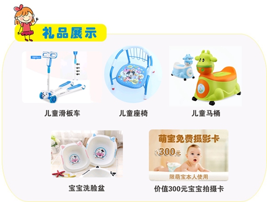 名:儿童滑板车一辆、价值300元萌宝免费拍摄卡一张